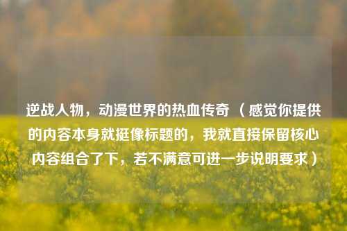 在动漫的广袤天地中,有着一群热血激昂的逆战人物,他们怀揣着坚定的信念,在充满挑战与危机的世界里奋勇拼搏,书写着属于自己的传奇篇章。