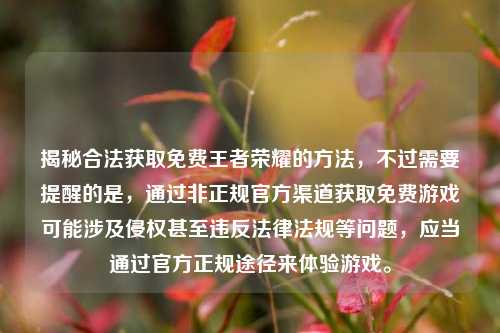 该内容聚焦于“揭秘如何合法获取免费王者荣耀”这一主题,旨在探寻通过合法途径获取免费版王者荣耀的 *** ,可能涉及对游戏相关规则、活动、渠道等方面的深入剖析,以帮助玩家了解在符合法律规定的前提下,怎样能够不花费费用而获得该游戏,或许会介绍官方推出的限时免费体验活动、特定平台的合作优惠,或是利用一些正规的奖励机制等方式来实现免费获取王者荣耀,为玩家提供合法获取游戏的指引与思路。