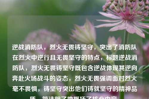 他们用青春和热血书写着逆行的篇章,用生命和汗水诠释着责任与担当,正是因为有了消防队这样一群逆战英雄,我们的城市才得以在危难时刻保持安宁,我们的生活才充满希望,他们是烈火中的勇士,是我们心中永远值得敬仰的逆战英雄,让我们向消防队致以最崇高的敬意,铭记他们在逆战中铸就的伟大精神。