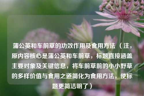 本文聚焦于车前草这一小小野草,探讨其多样价值与食用之道,车前草虽看似平凡,却有着独特功效与作用,如可能具备一定药用价值等,同时还提及了蒲公英和车前草的功效、作用及食用 ,了解这些内容,有助于我们知晓车前草等常见野草所蕴含的价值,无论是从健康养生角度,还是从探索自然植物的奇妙用途来看,都能让我们重新认识这些身边的野草,挖掘它们在生活中的潜在益处,为生活增添别样色彩。