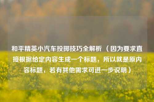 掌握和平精英小汽车的投掷技巧,能让你在游戏中拥有更多的机动性和战术选择,增加在战场上生存和获胜的几率,不断练习和摸索,就能在关键时刻巧妙运用小汽车投掷,为自己创造更多优势,成为游戏中的高手。