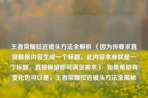 掌握王者荣耀拉近镜头的方法对于提升游戏表现至关重要,玩家要熟练运用基础操作、了解英雄技能与镜头的关联,并根据自身习惯调整镜头灵敏度,从而在各种战局中都能灵活地获取清晰的战场视野,做出更明智的决策,助力自己在游戏中取得胜利。